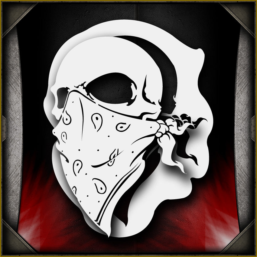 This dead desperado has a paisley pattern bandanna covering the lower half of his skull, hiding his bony visage. A great way to keep skeletal bugs out of his teeth too! We're pleased to introduce our Bandanna Skull line of stencils! These stencils feature skulls wearing biker styled bandannas. All of our Bandanna Skull stencils come with the positive and negative cutouts that make shading a lot easier! From our Skulls line of stencils. Suitable for motorcycles, cars, tatoos, cakes, t-shirts, graphic arts, and all types of DIY craft project. All mylar stencils are durable & reusable that can be used with solvent or water-based based paints including automotive urethane, water based acrylics and body art tattoo paint. Overall size in inches: 10.5" x 8" Painted size in inches: 9.25" x 6.5"