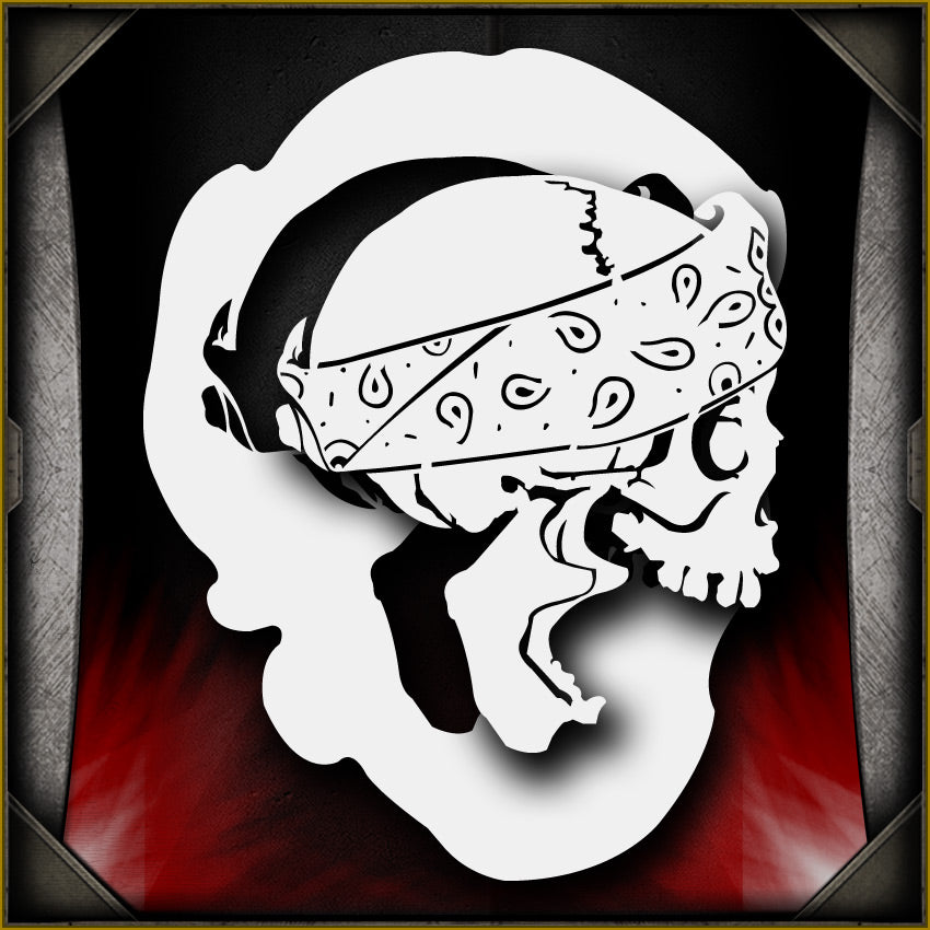 Bandanna Skull 4 shows a profile view of a screaming skull wearing a paisley pattern bandanna. We're pleased to introduce our Bandanna Skull line of stencils! These stencils feature skulls wearing biker styled bandannas. All of our Bandanna Skull stencils come with the positive and negative cutouts that make shading a lot easier! From our Skulls line of stencils. Suitable for motorcycles, cars, tatoos, cakes, t-shirts, graphic arts, and all types of DIY craft project. All mylar stencils are durable & reusable that can be used with solvent or water-based based paints including automotive urethane, water based acrylics and body art tattoo paint. Overall size in inches: 10.5" x 8" Painted size in inches: 7.25" x 6.5"