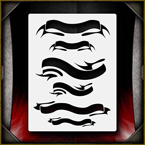 This banner stencil has 6 different banner shapes on it. Three different styles of banner, along with a mini version of each one, all together on one stencil make it easy for you to find the banner that's just right for your current project. Our stencils are perfect for advanced professionals and beginners, ideal for every use and in high demand among airbrush and tattoo artists, US car and motorcycle customizers, and even leading clothing brands. Everyone can benefit from each of our products and future hot designs in development can significantly shorten the process of becoming an airbrush expert. We provide stencils in top laser quality, with the hottest trending lettering and graphic designs, as well as in the textile and advertising industries. All professional designs are reusable precision laser cut and made out of solvent proof thick mylar material. The clean laser cut edges of this design allow you to create quick, consistent and repeatable highly detailed professional artwork. Unlike our competitors with inferior clip-art and traditional designs, we create only high quality and unique designs that will outlast the others. This banner stencil has 6 different banner shapes on it. Three different styles of banner, along with a mini version of each one, all together on one stencil make it easy for you to find the banner that's just right for your current project.