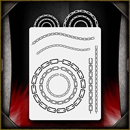 This stencil contains many different chains that you can use for any project. Circular chains, straight chains, and chains with a slight bend to them means that this stencil can be utilized in as many ways as you can think up. Also contains detailed circular chains along the edge to aid with masking and drop shadows. Perfect for all airbrush experience levels. These will be a valuable aid for beginners to gain useful experience and will help professionals save valuable time. Our stencils are perfect for advanced professionals and beginners, ideal for every use and in high demand among airbrush and tattoo artists, US car and motorcycle customizers, and even leading clothing brands. Everyone can benefit from each of our products and future hot designs in development can significantly shorten the process of becoming an airbrush expert. We provide stencils in top laser quality, with the hottest trending lettering and graphic designs, as well as in the textile and advertising industries. All professional designs are reusable precision laser cut and made out of solvent proof thick mylar material. The clean laser cut edges of this design allow you to create quick, consistent and repeatable highly detailed professional artwork. Unlike our competitors with inferior clip-art and traditional designs, we create only high quality and unique designs that will outlast the others. Suitable for motorcycles, cars, tattoos, cake decorating, t-shirts, arts, and all kinds of DIY projects. From our Patterns / Textures line of stencils.