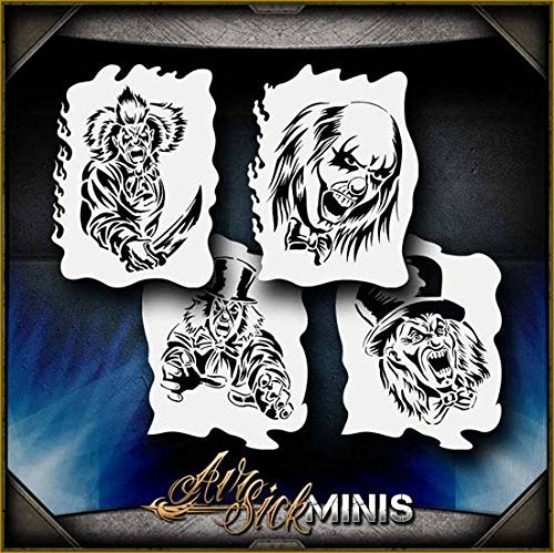 This set of 4 mini stencils contains 4 different horrifying clowns that will add a frightening element to your work. Stencils all contain rounded edges to aid with shading, while 2 of them contain edges with more complex details that can be used to create flames, texturing, or a variety of uses. Perfect for all airbrush experience levels. These will be a valuable aid for beginners to gain useful experience and will help professionals save valuable time. Our stencils are perfect for advanced professionals and beginners, ideal for every use and in high demand among airbrush and tattoo artists, US car and motorcycle customizers, and even leading clothing brands. Everyone can benefit from each of our products and future hot designs in development can significantly shorten the process of becoming an airbrush expert. We provide stencils in top laser quality, with the hottest trending lettering and graphic designs, as well as in the textile and advertising industries. All professional designs are reusable precision laser cut and made out of solvent proof thick mylar material. The clean laser cut edges of this design allow you to create quick, consistent and repeatable highly detailed professional artwork. Unlike our competitors with inferior clip-art and traditional designs, we create only high quality and unique designs that will outlast the others. Suitable for motorcycles, cars, tattoos, cake decorating, t-shirts, arts, and all kinds of DIY projects. From our Clowns line of stencils.
