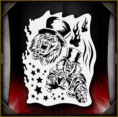 Everyone's scared of clowns right? No? Well, they will be after seeing your work using this terrifying clown-themed stencil. Contains many different elements that can be used in a variety of ways, including flames, stars, and slashes. Perfect for all airbrush experience levels. These will be a valuable aid for beginners to gain useful experience and will help professionals save valuable time. Our stencils are perfect for advanced professionals and beginners, ideal for every use and in high demand among airbrush and tattoo artists, US car and motorcycle customizers, and even leading clothing brands. Everyone can benefit from each of our products and future hot designs in development can significantly shorten the process of becoming an airbrush expert. We provide stencils in top laser quality, with the hottest trending lettering and graphic designs, as well as in the textile and advertising industries. All professional designs are reusable precision laser cut and made out of solvent proof thick mylar material. The clean laser cut edges of this design allow you to create quick, consistent and repeatable highly detailed professional artwork. Unlike our competitors with inferior clip-art and traditional designs, we create only high quality and unique designs that will outlast the others. Suitable for motorcycles, cars, tattoos, cake decorating, t-shirts, arts, and all kinds of DIY projects. From our Clowns line of stencils.