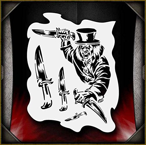 Everyone's scared of clowns right? No? Well, they will be after seeing your work using this terrifying clown-themed stencil. This highly detailed stencil contains a Jack-the-Ripper style clown, wearing an overcoat and top hat and armed with 2 knives. The stencil also contains 3 other knives in various sizes. The edges are curved to aid with shading. Perfect for all airbrush experience levels. These will be a valuable aid for beginners to gain useful experience and will help professionals save valuable time. Our stencils are perfect for advanced professionals and beginners, ideal for every use and in high demand among airbrush and tattoo artists, US car and motorcycle customizers, and even leading clothing brands. Everyone can benefit from each of our products and future hot designs in development can significantly shorten the process of becoming an airbrush expert. We provide stencils in top laser quality, with the hottest trending lettering and graphic designs, as well as in the textile and advertising industries. All professional designs are reusable precision laser cut and made out of solvent proof thick mylar material. The clean laser cut edges of this design allow you to create quick, consistent and repeatable highly detailed professional artwork. Unlike our competitors with inferior clip-art and traditional designs, we create only high quality and unique designs that will outlast the others. Suitable for motorcycles, cars, tattoos, cake decorating, t-shirts, arts, and all kinds of DIY projects. From our Clowns line of stencils.