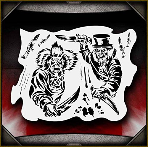 Everyone's scared of clowns right? No? Well, they will be after seeing your work using this terrifying clown-themed stencil. This terrifying stencil contains 2 knife-wielding clowns, blood spatters, rips, and knife stencils in 2 different sizes. The edges are curved to aid with shading. Perfect for all airbrush experience levels. These will be a valuable aid for beginners to gain useful experience and will help professionals save valuable time. Our stencils are perfect for advanced professionals and beginners, ideal for every use and in high demand among airbrush and tattoo artists, US car and motorcycle customizers, and even leading clothing brands. Everyone can benefit from each of our products and future hot designs in development can significantly shorten the process of becoming an airbrush expert. We provide stencils in top laser quality, with the hottest trending lettering and graphic designs, as well as in the textile and advertising industries. All professional designs are reusable precision laser cut and made out of solvent proof thick mylar material. The clean laser cut edges of this design allow you to create quick, consistent and repeatable highly detailed professional artwork. Unlike our competitors with inferior clip-art and traditional designs, we create only high quality and unique designs that will outlast the others. Suitable for motorcycles, cars, tattoos, cake decorating, t-shirts, arts, and all kinds of DIY projects. From our Clowns line of stencils.