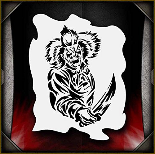 Everyone's scared of clowns right? No? Well, they will be after seeing your work using this terrifying clown-themed stencil. This highly detailed stencil depicts a knife-wielding maniac of a clown. The edges of the stencil are curved to aid with shading. Perfect for all airbrush experience levels. These will be a valuable aid for beginners to gain useful experience and will help professionals save valuable time. Our stencils are perfect for advanced professionals and beginners, ideal for every use and in high demand among airbrush and tattoo artists, US car and motorcycle customizers, and even leading clothing brands. Everyone can benefit from each of our products and future hot designs in development can significantly shorten the process of becoming an airbrush expert. We provide stencils in top laser quality, with the hottest trending lettering and graphic designs, as well as in the textile and advertising industries. All professional designs are reusable precision laser cut and made out of solvent proof thick mylar material. The clean laser cut edges of this design allow you to create quick, consistent and repeatable highly detailed professional artwork. Unlike our competitors with inferior clip-art and traditional designs, we create only high quality and unique designs that will outlast the others. Suitable for motorcycles, cars, tattoos, cake decorating, t-shirts, arts, and all kinds of DIY projects. From our Clowns line of stencils.