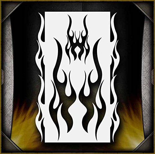 This highly detailed stencil depicts our flame design, and has detailed edges as well to aid with masking, drop shadows and shading. Perfect for all airbrush experience levels. These will be a valuable aid for beginners to gain useful experience and will help professionals save valuable time. Our stencils are perfect for advanced professionals and beginners, ideal for every use and in high demand among airbrush and tattoo artists, US car and motorcycle customizers, and even leading clothing brands. Everyone can benefit from each of our products and future hot designs in development can significantly shorten the process of becoming an airbrush expert. We provide stencils in top laser quality, with the hottest trending lettering and graphic designs, as well as in the textile and advertising industries. All professional designs are reusable precision laser cut and made out of solvent proof thick mylar material. The clean laser cut edges of this design allow you to create quick, consistent and repeatable highly detailed professional artwork. Unlike our competitors with inferior clip-art and traditional designs, we create only high quality and unique designs that will outlast the others. Suitable for motorcycles, cars, tattoos, cake decorating, t-shirts, arts, and all kinds of DIY projects. From our Flames line of stencils.