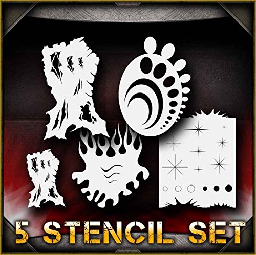 This 5 stencil set contains our Sparkles stencil, Ovals, Flames #10, and 2 different sizes of our Rip Maker stencil. A great set of tools that will make life easier for the freehand airbrush artist. Perfect for all airbrush experience levels. These will be a valuable aid for beginners to gain useful experience and will help professionals save valuable time. Our stencils are perfect for advanced professionals and beginners, ideal for every use and in high demand among airbrush and tattoo artists, US car and motorcycle customizers, and even leading clothing brands. Everyone can benefit from each of our products and future hot designs in development can significantly shorten the process of becoming an airbrush expert. We provide stencils in top laser quality, with the hottest trending lettering and graphic designs, as well as in the textile and advertising industries. All professional designs are reusable precision laser cut and made out of solvent proof thick mylar material. The clean laser cut edges of this design allow you to create quick, consistent and repeatable highly detailed professional artwork. Unlike our competitors with inferior clip-art and traditional designs, we create only high quality and unique designs that will outlast the others. Suitable for motorcycles, cars, tattoos, cake decorating, t-shirts, arts, and all kinds of DIY projects. From our Specials & Sets line of stencils.
