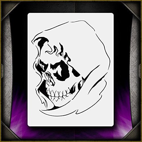 This detailed stencil depicts the grim reaper, death himself, in a menacing pose. A perfect addition to any project to give it a dark, creepy feel. Perfect for all airbrush experience levels. These will be a valuable aid for beginners to gain useful experience and will help professionals save valuable time. Our stencils are perfect for advanced professionals and beginners, ideal for every use and in high demand among airbrush and tattoo artists, US car and motorcycle customizers, and even leading clothing brands. Everyone can benefit from each of our products and future hot designs in development can significantly shorten the process of becoming an airbrush expert. We provide stencils in top laser quality, with the hottest trending lettering and graphic designs, as well as in the textile and advertising industries. All professional designs are reusable precision laser cut and made out of solvent proof thick mylar material. The clean laser cut edges of this design allow you to create quick, consistent and repeatable highly detailed professional artwork. Unlike our competitors with inferior clip-art and traditional designs, we create only high quality and unique designs that will outlast the others. Suitable for motorcycles, cars, tattoos, cake decorating, t-shirts, arts, and all kinds of DIY projects. From our Grim Reapers line of stencils.