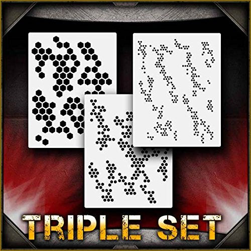 This 3 stencil set contains all 3 of our HEXPAT style stencils. This new and modern camo pattern is sure to bring new life into your art work. Versatile in size and shape, the possibilities are endless! Perfect for all airbrush experience levels. These will be a valuable aid for beginners to gain useful experience and will help professionals save valuable time. Our stencils are perfect for advanced professionals and beginners, ideal for every use and in high demand among airbrush and tattoo artists, US car and motorcycle customizers, and even leading clothing brands. Everyone can benefit from each of our products and future hot designs in development can significantly shorten the process of becoming an airbrush expert. We provide stencils in top laser quality, with the hottest trending lettering and graphic designs, as well as in the textile and advertising industries. All professional designs are reusable precision laser cut and made out of solvent proof thick mylar material. The clean laser cut edges of this design allow you to create quick, consistent and repeatable highly detailed professional artwork. Unlike our competitors with inferior clip-art and traditional designs, we create only high quality and unique designs that will outlast the others. Suitable for motorcycles, cars, tattoos, cake decorating, t-shirts, arts, and all kinds of DIY projects. From our Specials & Sets line of stencils.