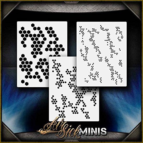 This mini 3 stencil set contains all 3 of our mini HEXPAT style stencils. This new and modern camo pattern is sure to bring new life into your art work. Versatile in size and shape, the possibilities are endless! Perfect for all airbrush experience levels. These will be a valuable aid for beginners to gain useful experience and will help professionals save valuable time. Our stencils are perfect for advanced professionals and beginners, ideal for every use and in high demand among airbrush and tattoo artists, US car and motorcycle customizers, and even leading clothing brands. Everyone can benefit from each of our products and future hot designs in development can significantly shorten the process of becoming an airbrush expert. We provide stencils in top laser quality, with the hottest trending lettering and graphic designs, as well as in the textile and advertising industries. All professional designs are reusable precision laser cut and made out of solvent proof thick mylar material. The clean laser cut edges of this design allow you to create quick, consistent and repeatable highly detailed professional artwork. Unlike our competitors with inferior clip-art and traditional designs, we create only high quality and unique designs that will outlast the others. Suitable for motorcycles, cars, tattoos, cake decorating, t-shirts, arts, and all kinds of DIY projects. From our Mini's line of stencils.