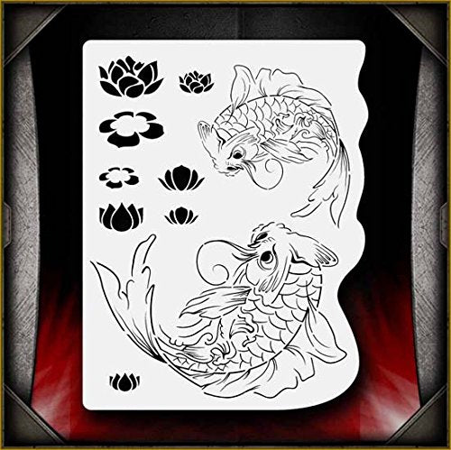 This Multi Composition stencil contains two highly detailed koi fish, as well as different styles of lotus and lily flowers in various sizes. Everything you need to create a beautiful koi pond in one stencil. Perfect for all airbrush experience levels. These will be a valuable aid for beginners to gain useful experience and will help professionals save valuable time. Our stencils are perfect for advanced professionals and beginners, ideal for every use and in high demand among airbrush and tattoo artists, US car and motorcycle customizers, and even leading clothing brands. Everyone can benefit from each of our products and future hot designs in development can significantly shorten the process of becoming an airbrush expert. We provide stencils in top laser quality, with the hottest trending lettering and graphic designs, as well as in the textile and advertising industries. All professional designs are reusable precision laser cut and made out of solvent proof thick mylar material. The clean laser cut edges of this design allow you to create quick, consistent and repeatable highly detailed professional artwork. Unlike our competitors with inferior clip-art and traditional designs, we create only high quality and unique designs that will outlast the others. Suitable for motorcycles, cars, tattoos, cake decorating, t-shirts, arts, and all kinds of DIY projects. From our Multi Composition line of stencils.