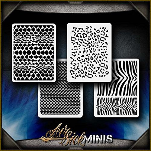 This 4 mini stencil set offers a variety of different animal patterns. It contains our reptile skin design, our leopard print design, our fish scale design, and our zebra print design. The zebra print design has 2 different sizes on the stencil for you to choose from. No matter what creature you can dream up, now you have options for what kind of skin you want to give it. Perfect for all airbrush experience levels. These will be a valuable aid for beginners to gain useful experience and will help professionals save valuable time. Our stencils are perfect for advanced professionals and beginners, ideal for every use and in high demand among airbrush and tattoo artists, US car and motorcycle customizers, and even leading clothing brands. Everyone can benefit from each of our products and future hot designs in development can significantly shorten the process of becoming an airbrush expert. We provide stencils in top laser quality, with the hottest trending lettering and graphic designs, as well as in the textile and advertising industries. All professional designs are reusable precision laser cut and made out of solvent proof thick mylar material. The clean laser cut edges of this design allow you to create quick, consistent and repeatable highly detailed professional artwork. Unlike our competitors with inferior clip-art and traditional designs, we create only high quality and unique designs that will outlast the others. Suitable for motorcycles, cars, tattoos, cake decorating, t-shirts, arts, and all kinds of DIY projects. From our Mini's line of stencils.