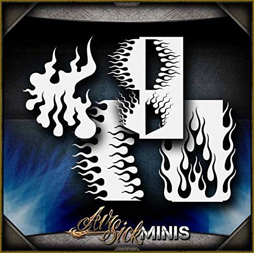 Our Mini Flames stencil set contains 4 mini versions of our flames design. The set features several different styles of flames in varying sizes, and detailed edges to make masking, drop shadows and shading easier. Perfect for all airbrush experience levels. These will be a valuable aid for beginners to gain useful experience and will help professionals save valuable time. Our stencils are perfect for advanced professionals and beginners, ideal for every use and in high demand among airbrush and tattoo artists, US car and motorcycle customizers, and even leading clothing brands. Everyone can benefit from each of our products and future hot designs in development can significantly shorten the process of becoming an airbrush expert. We provide stencils in top laser quality, with the hottest trending lettering and graphic designs, as well as in the textile and advertising industries. All professional designs are reusable precision laser cut and made out of solvent proof thick mylar material. The clean laser cut edges of this design allow you to create quick, consistent and repeatable highly detailed professional artwork. Unlike our competitors with inferior clip-art and traditional designs, we create only high quality and unique designs that will outlast the others. Suitable for motorcycles, cars, tattoos, cake decorating, t-shirts, arts, and all kinds of DIY projects. From our Mini's line of stencils.