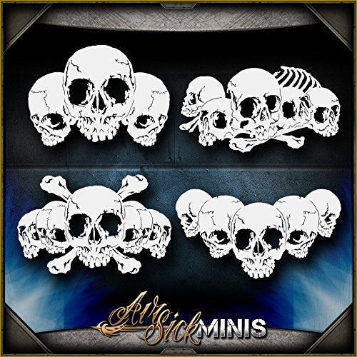 This 4 stencil mini set contains 4 of our exquisitely detailed skull backgrounds, making it easy to pick the background that's just right for your project. Or can be used to add a pile of skulls into a work of art that isn't quite complete without a pile of skulls. Perfect for all airbrush experience levels. These will be a valuable aid for beginners to gain useful experience and will help professionals save valuable time. Our stencils are perfect for advanced professionals and beginners, ideal for every use and in high demand among airbrush and tattoo artists, US car and motorcycle customizers, and even leading clothing brands. Everyone can benefit from each of our products and future hot designs in development can significantly shorten the process of becoming an airbrush expert. We provide stencils in top laser quality, with the hottest trending lettering and graphic designs, as well as in the textile and advertising industries. All professional designs are reusable precision laser cut and made out of solvent proof thick mylar material. The clean laser cut edges of this design allow you to create quick, consistent and repeatable highly detailed professional artwork. Unlike our competitors with inferior clip-art and traditional designs, we create only high quality and unique designs that will outlast the others. Suitable for motorcycles, cars, tattoos, cake decorating, t-shirts, arts, and all kinds of DIY projects. From our Mini line of stencils.