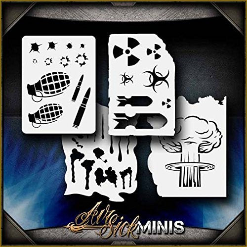 War never changes. But your needs change from project to project. This set of 4 mini stencils has everything you need for a warfare themed project. Grenades, bullets and bullet holes. Bombs, bio hazard symbols and nuclear bomb warnings. Blood drops and spatters. And if that isn't enough, the mushroom cloud stencil will take care of it. 3 of the stencils feature detailed edges to make shading easier. Perfect for all airbrush experience levels. These will be a valuable aid for beginners to gain useful experience and will help professionals save valuable time. Our stencils are perfect for advanced professionals and beginners, ideal for every use and in high demand among airbrush and tattoo artists, US car and motorcycle customizers, and even leading clothing brands. Everyone can benefit from each of our products and future hot designs in development can significantly shorten the process of becoming an airbrush expert. We provide stencils in top laser quality, with the hottest trending lettering and graphic designs, as well as in the textile and advertising industries. All professional designs are reusable precision laser cut and made out of solvent proof thick mylar material. The clean laser cut edges of this design allow you to create quick, consistent and repeatable highly detailed professional artwork. Unlike our competitors with inferior clip-art and traditional designs, we create only high quality and unique designs that will outlast the others. Suitable for motorcycles, cars, tattoos, cake decorating, t-shirts, arts, and all kinds of DIY projects. From our Mini's line of stencils.