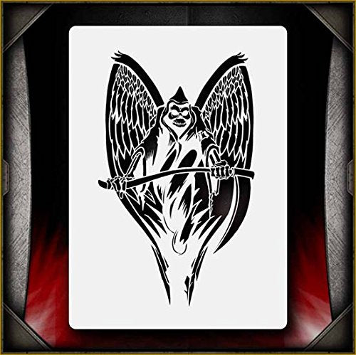 This highly detailed airbrush stencil features a grim reaper floating in the air, held aloft by angel wings. In his hands he holds his scythe. Perfect for all airbrush experience levels. These will be a valuable aid for beginners to gain useful experience and will help professionals save valuable time. Our stencils are perfect for advanced professionals and beginners, ideal for every use and in high demand among airbrush and tattoo artists, US car and motorcycle customizers, and even leading clothing brands. Everyone can benefit from each of our products and future hot designs in development can significantly shorten the process of becoming an airbrush expert. We provide stencils in top laser quality, with the hottest trending lettering and graphic designs, as well as in the textile and advertising industries. All professional designs are reusable precision laser cut and made out of solvent proof thick mylar material. The clean laser cut edges of this design allow you to create quick, consistent and repeatable highly detailed professional artwork. Unlike our competitors with inferior clip-art and traditional designs, we create only high quality and unique designs that will outlast the others. Suitable for motorcycles, cars, tattoos, cake decorating, t-shirts, arts, and all kinds of DIY projects. From our Tattoo Flash line of stencils.