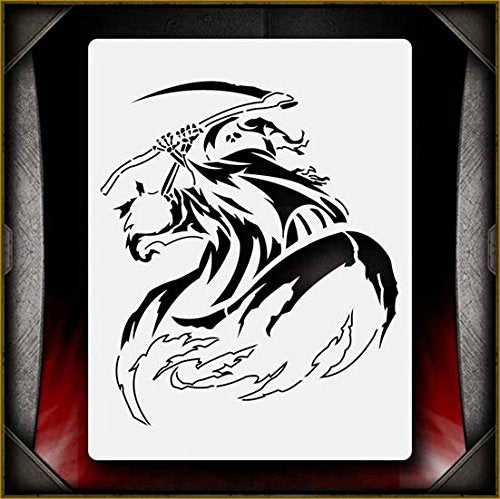 This detailed airbrush stencil features a grim reaper who appears to have just finished swinging his scythe, or is about to. Only his eye and nasal sockets appear above his flowing robes. Perfect for all airbrush experience levels. These will be a valuable aid for beginners to gain useful experience and will help professionals save valuable time. Our stencils are perfect for advanced professionals and beginners, ideal for every use and in high demand among airbrush and tattoo artists, US car and motorcycle customizers, and even leading clothing brands. Everyone can benefit from each of our products and future hot designs in development can significantly shorten the process of becoming an airbrush expert. We provide stencils in top laser quality, with the hottest trending lettering and graphic designs, as well as in the textile and advertising industries. All professional designs are reusable precision laser cut and made out of solvent proof thick mylar material. The clean laser cut edges of this design allow you to create quick, consistent and repeatable highly detailed professional artwork. Unlike our competitors with inferior clip-art and traditional designs, we create only high quality and unique designs that will outlast the others. Suitable for motorcycles, cars, tattoos, cake decorating, t-shirts, arts, and all kinds of DIY projects. From our Tattoo Flash line of stencils.