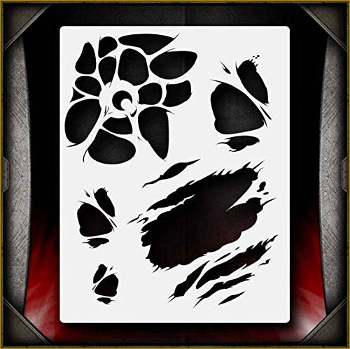 Our Ripped Flesh airbrush stencil offers a number of different styles that you can use to show ripped and damaged flesh. One of the designs contains an eyeball seemingly held in place by a patchwork of hanging skin. Perfect for all airbrush experience levels. These will be a valuable aid for beginners to gain useful experience and will help professionals save valuable time. Our stencils are perfect for advanced professionals and beginners, ideal for every use and in high demand among airbrush and tattoo artists, US car and motorcycle customizers, and even leading clothing brands. Everyone can benefit from each of our products and future hot designs in development can significantly shorten the process of becoming an airbrush expert. We provide stencils in top laser quality, with the hottest trending lettering and graphic designs, as well as in the textile and advertising industries. All professional designs are reusable precision laser cut and made out of solvent proof thick mylar material. The clean laser cut edges of this design allow you to create quick, consistent and repeatable highly detailed professional artwork. Unlike our competitors with inferior clip-art and traditional designs, we create only high quality and unique designs that will outlast the others. Suitable for motorcycles, cars, tattoos, cake decorating, t-shirts, arts, and all kinds of DIY projects. From our Ripped & Torn line of stencils.