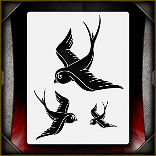 This airbrush stencil features a detailed sparrow, wings spread in flight. The stencil contains the design in 3 different sizes, making it easy to find the one that fits into your artwork. Perfect for all airbrush experience levels. These will be a valuable aid for beginners to gain useful experience and will help professionals save valuable time. Our stencils are perfect for advanced professionals and beginners, ideal for every use and in high demand among airbrush and tattoo artists, US car and motorcycle customizers, and even leading clothing brands. Everyone can benefit from each of our products and future hot designs in development can significantly shorten the process of becoming an airbrush expert. We provide stencils in top laser quality, with the hottest trending lettering and graphic designs, as well as in the textile and advertising industries. All professional designs are reusable precision laser cut and made out of solvent proof thick mylar material. The clean laser cut edges of this design allow you to create quick, consistent and repeatable highly detailed professional artwork. Unlike our competitors with inferior clip-art and traditional designs, we create only high quality and unique designs that will outlast the others. Suitable for motorcycles, cars, tattoos, cake decorating, t-shirts, arts, and all kinds of DIY projects. From our Tattoo Flash line of stencils.