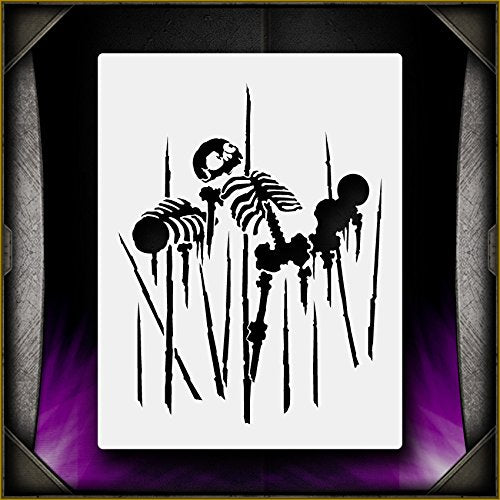 Our Spiked Skeleton design features a number of skeletons impaled on spikes. This dark image is a great addition to any graveyard scene, or adds an eerie element to any project. Perfect for all airbrush experience levels. These will be a valuable aid for beginners to gain useful experience and will help professionals save valuable time. Our stencils are perfect for advanced professionals and beginners, ideal for every use and in high demand among airbrush and tattoo artists, US car and motorcycle customizers, and even leading clothing brands. Everyone can benefit from each of our products and future hot designs in development can significantly shorten the process of becoming an airbrush expert. We provide stencils in top laser quality, with the hottest trending lettering and graphic designs, as well as in the textile and advertising industries. All professional designs are reusable precision laser cut and made out of solvent proof thick mylar material. The clean laser cut edges of this design allow you to create quick, consistent and repeatable highly detailed professional artwork. Unlike our competitors with inferior clip-art and traditional designs, we create only high quality and unique designs that will outlast the others. Suitable for motorcycles, cars, tattoos, cake decorating, t-shirts, arts, and all kinds of DIY projects. From our Grim Reapers line of airbrush stencils.
