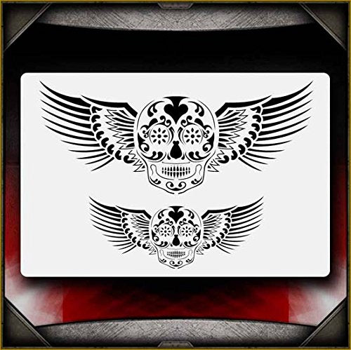 Sugar Skulls are one of the most popular symbols of the Mexican holiday Dia de los Muertos, The Day of the Dead. This version of our Sugar Skulls stencils features an elaborate sugar skull, filled with whirling designs and with wings framing it. The stencil features 2 different sizes of this exquisite design. Perfect for all airbrush experience levels. These will be a valuable aid for beginners to gain useful experience and will help professionals save valuable time. Our stencils are perfect for advanced professionals and beginners, ideal for every use and in high demand among airbrush and tattoo artists, US car and motorcycle customizers, and even leading clothing brands. Everyone can benefit from each of our products and future hot designs in development can significantly shorten the process of becoming an airbrush expert. We provide stencils in top laser quality, with the hottest trending lettering and graphic designs, as well as in the textile and advertising industries. All professional designs are reusable precision laser cut and made out of solvent proof thick mylar material. The clean laser cut edges of this design allow you to create quick, consistent and repeatable highly detailed professional artwork. Unlike our competitors with inferior clip-art and traditional designs, we create only high quality and unique designs that will outlast the others. Suitable for motorcycles, cars, tattoos, cake decorating, t-shirts, arts, and all kinds of DIY projects. From our World Cultures line of airbrush stencils.