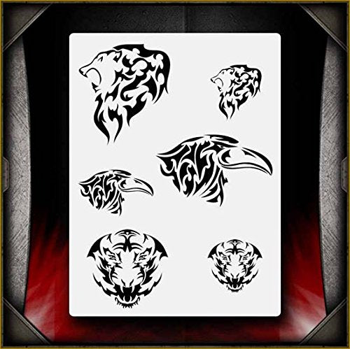 This highly detailed stencil features our 3 different Tribal Animals designs, with 2 sizes of each design featured on the stencil. Contains a tribal lion head design, a tribal eagle's head, and a tribal tiger's head as viewed from the front. Perfect for all airbrush experience levels. These will be a valuable aid for beginners to gain useful experience and will help professionals save valuable time. Our stencils are perfect for advanced professionals and beginners, ideal for every use and in high demand among airbrush and tattoo artists, US car and motorcycle customizers, and even leading clothing brands. Everyone can benefit from each of our products and future hot designs in development can significantly shorten the process of becoming an airbrush expert. We provide stencils in top laser quality, with the hottest trending lettering and graphic designs, as well as in the textile and advertising industries. All professional designs are reusable precision laser cut and made out of solvent proof thick mylar material. The clean laser cut edges of this design allow you to create quick, consistent and repeatable highly detailed professional artwork. Unlike our competitors with inferior clip-art and traditional designs, we create only high quality and unique designs that will outlast the others. Suitable for motorcycles, cars, tattoos, cake decorating, t-shirts, arts, and all kinds of DIY projects. From our Tribal & Pinstripes line of airbrush stencils.