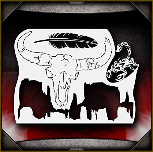 This Multi Composition airbrush stencil features several of our Western Desert elements. A large bull's skull. A highly detailed feather. An exquisitely detailed scorpion. Towering mesas. The edges of the stencil are detailed to aid with shading. Perfect for all airbrush experience levels. These will be a valuable aid for beginners to gain useful experience and will help professionals save valuable time. Our stencils are perfect for advanced professionals and beginners, ideal for every use and in high demand among airbrush and tattoo artists, US car and motorcycle customizers, and even leading clothing brands. Everyone can benefit from each of our products and future hot designs in development can significantly shorten the process of becoming an airbrush expert. We provide stencils in top laser quality, with the hottest trending lettering and graphic designs, as well as in the textile and advertising industries. All professional designs are reusable precision laser cut and made out of solvent proof thick mylar material. The clean laser cut edges of this design allow you to create quick, consistent and repeatable highly detailed professional artwork. Unlike our competitors with inferior clip-art and traditional designs, we create only high quality and unique designs that will outlast the others. Suitable for motorcycles, cars, tattoos, cake decorating, t-shirts, arts, and all kinds of DIY projects. From our Multi Composition line of stencils.